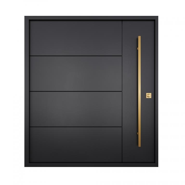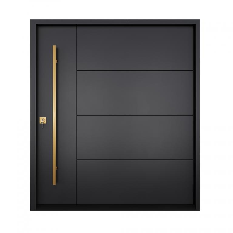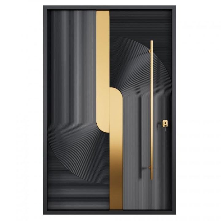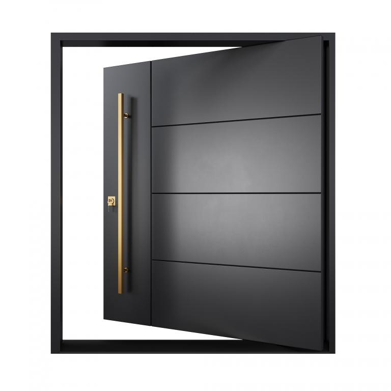 ALICANTE PIVOT RH Metal Pivot Door 72 X 81 RIGHT HAND INSWING FLAT BLACK Color STEEL Material PULL HANDLE #055 BRUSHED GOLD SQUARE 59″ SQUARE DEADBOLT 8469 – SINGLE CYLINDER (SATIN BRASS (US4)) SINGLE SQUARE TOP Modern, Contemporary Style solid, Residential, Commercial (Pull Handles and Locks are price separately)